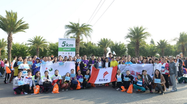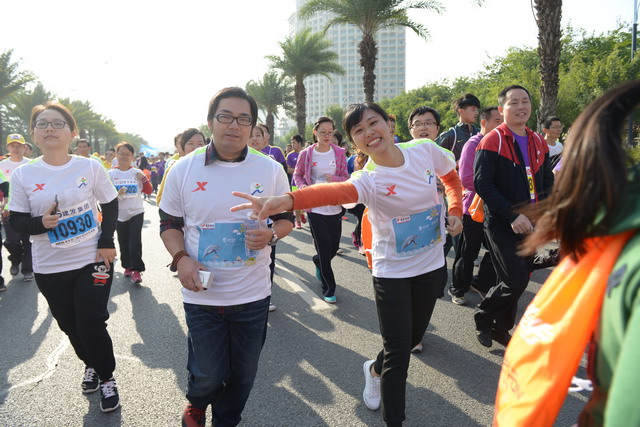 盡管冬日清晨有些凍人,但這絲毫沒有“凍”壞象嶼人的熱情。一進(jìn)入賽場,大家就摩拳擦掌,躍躍欲試。今年的馬拉松對(duì)象嶼跑團(tuán)而言,有著特殊的意義,這不僅是一場健康跑,更是一場公益跑。此次比賽跑道恰好與火燒嶼隔海相望,由集團(tuán)捐資建立的中華白海豚救護(hù)繁育基地正坐落島上。白海豚的可愛形象也隨之出現(xiàn)在象嶼“跑男”“跑女”的前胸、后背。公益旗幟、白海豚公益宣傳貼紙,紅帆logo,以及我們朝氣蓬勃的象嶼跑團(tuán)組成了一道“有愛”的風(fēng)景線。這也吸引了周圍許多馬拉松參賽者的目光,有的參賽者甚至圍上前來詢問是否也能加入其中。于是,象嶼救助白海豚的公益之舉隨著象嶼人的奔跑也一路傳播開來。